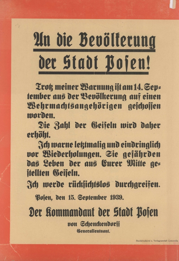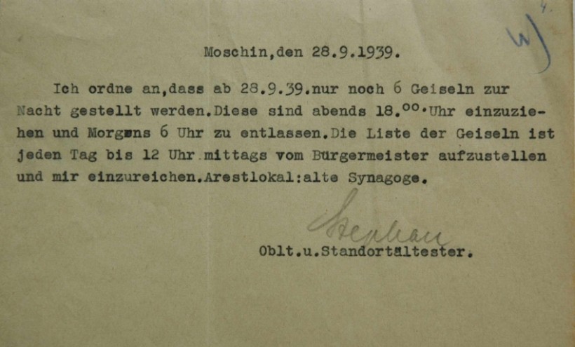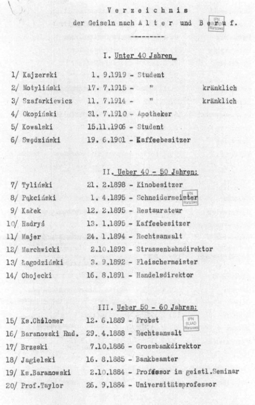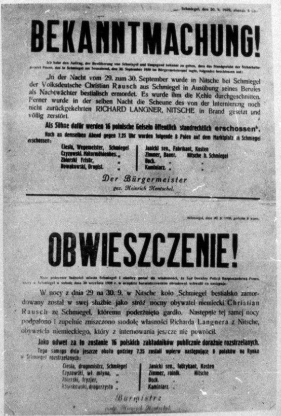 Od początku działań wojennych stosowano wobec polskiej ludności zasadę zbiorowej odpowiedzialności. Polegała ona na wyznaczaniu zakładników, którzy swoim życiem gwarantować mieli bezpieczeństwo niemieckich żołnierzy oraz Volksdeutschów. Wybierano osoby znane i szanowane w swoim środowisku, reprezentujące szeroki wachlarz zawodów i grup społecznych. W wypadku wystąpień przeciwko żołnierzom Wehrmachtu lub cywilnym Niemcom zakładnicy mieli być natychmiast rozstrzelani. Formalnie zarządzenie nakazujące branie zakładników w miejscowościach, w których stacjonowały jednostki Wehrmachtu wydał gen. Alfred von Vollard-Bockelberg dopiero 21 września 1939 r. Szczególną rolę w fizycznym unicestwieniu ludności polskiej odegrały powołane tego samego dnia policyjne sądy doraźne (Polizeistandgericht), działające przy grupach operacyjnych policji bezpieczeństwa(Einsatzgruppen der Sicherheitspolizei und des Sicherheitsdienstes).