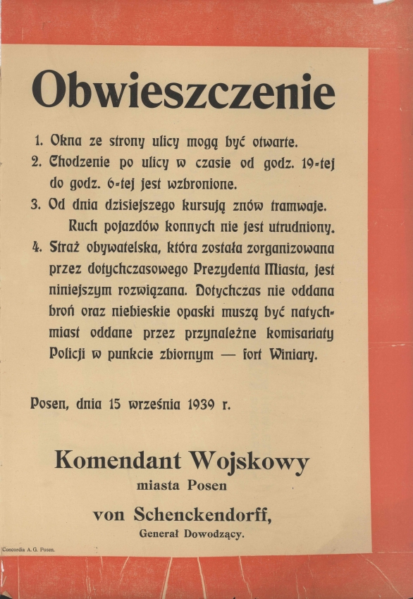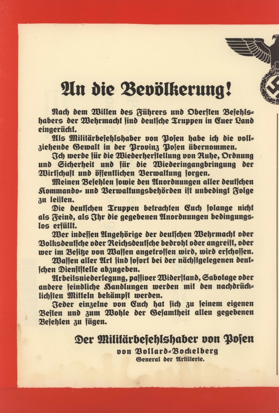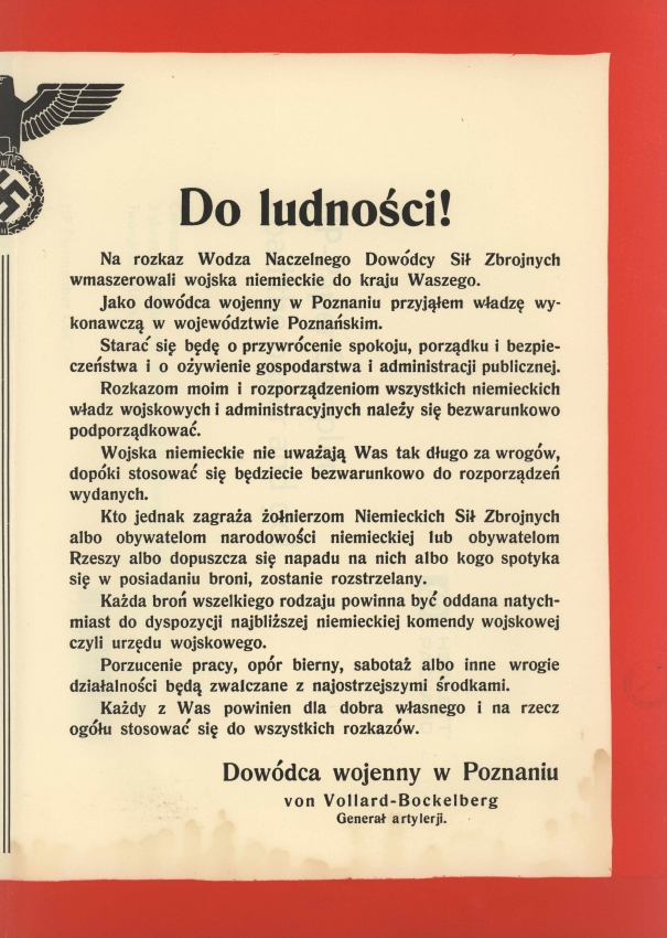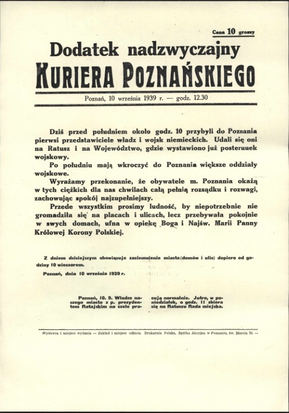 1 września 1939 r. we wczesnych godzinach rannych niemieckie siły zbrojne wkroczyły do Wielkopolski. Zagrożona otoczeniem Armia "Poznań" zmuszona była do pospiesznego wycofywania się na wschód i już 7 września opuściła teren Wielkopolski, osłaniana przez. bataliony Obrony Narodowej. Do centralnej Wielkopolski oddziały Wehrmachtu dotarły 10 września. W tym dniu zajęte zostały m.in. miasta Poznań, Środa i Września, a następnego dnia Gniezno i Mogilno. W ciągu dwudziestu dni wojny pod okupacją niemiecką znalazła się cała Wielkopolska. Do 25 października 1939 r. pełnię władzy na tym terenie miała niemiecka administracja wojskowa, kierowana przez gen. Alfreda von Vollard-Bockelberga, jako dowódcy poznańskiego okręgu wojskowego. Podlegał mu zarząd cywilny, na którego czele stanął Arthur Greiser, późniejszy namiestnik Kraju Warty.